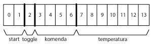 Drugim zabezpieczeniem jest odpowiednia struktura ramki danych: jest to zmodyfikowana ramka RC5. Szczegóły pokazano na rysunku 9. Dwa pierwsze bity to bity startu (zawsze o wartości 1), służą dostrojeniu odbiornika. Bit o numerze 2 zmienia się swoją wartość przy każdej wysłanej transmisji, w tym zastosowaniu nie jest jednak wykorzystywany.