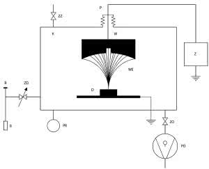 Gaz jest podawany do komory z butli B przy użyciu zaworu z reduktorem na butli R oraz zaworu dozującego ZD. Jednocześnie gaz jest odpompowywany poprzez kanał próżniowy z zaworem odcinającym ZO przy użyciu pompy obrotowej PO, zatem spawanie odbywa się w przepływie gazu szlachetnego.