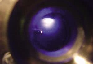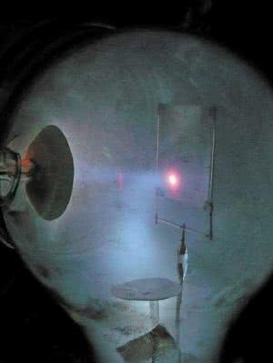 Fotografia 3. Lampa do pokazu zjawiska grzania cienkiej folii molibdenowej za pomocą promieni katodowych. Widoczny jest bieg pierwotnej i wtórnej wiązki elektronowej, które jonizują gaz świecący na niebiesko.