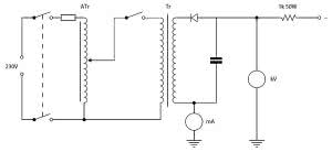 Rezystor drutowy włączony szeregowo z ujemnym biegunem zasilacza zabezpiecza przed wystąpieniem łuku w spawarce, który mógłby skutkować uszkodzeniem doprowadzenia katody. Pomiar napięcia wyjściowego odbywa się przy użyciu kilowoltomierza, zaś pomiar natężenia prądu wiązki odbywa się za pomocą miliamperomierza. Schemat elektryczny zasilacza zamieszczono na rysunku 6.