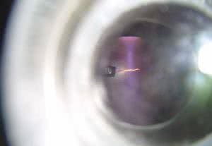 Następnie, dozuje się zaworem argon (w niektórych wypadkach może być dozowane powietrze) do ciśnienia ok. 0,1 Tr i włącza zasilacz spawarki stopniowo zwiększając napięcie do 500...800 V. Przy tym napięciu wiązka elektronów powinna być już widoczna. Wystąpienie silnych wyładowań lub łuku w komorze świadczy o za wysokim ciśnieniu lub zabrudzeniu katody.