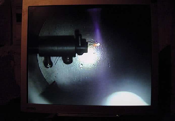 W trakcie procesu można w razie potrzeby dokonywać obrotu i przesuwania detalu w komorze. Po zakończonym procesie spawania wyłącza się zasilacz, zakręca się zawór dozujący, wyłącza się pompę i zapowietrza się komorę. Po otwarciu komory można wyjąć z komory gotowy detal. Należy jednak odczekać chwilę, by detal ostygł, aby uniknąć poparzenia. Na kolejnych zdjęciach (fotografia 8...11) pokazano widok wnętrza komory przy zbyt niskim ciśnieniu roboczym, za wysokim ciśnieniu i optymalnym ciśnieniu.
