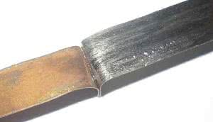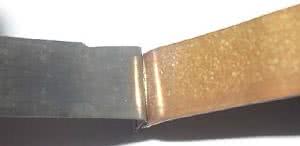 Wykonano także próby łączenia cienkich blach (fotografia 13 i fotografia 14). Łączone były: miedź z nichromem, miedź z niklem, a także miedź ze stalą nierdzewną. Możliwe było spawanie blach do grubości około 0,4 mm. Dodatkowo, wykonano próby spawania cienkich blach ze stali nierdzewnej. W tym ostatnim wypadku nie uzyskano próżnioszczelnych połączeń (fotografia 15), z uwagi na zbyt małą moc wiązki i niewłaściwy, nierównomierny obrót próbki (mała wprawa operatora).