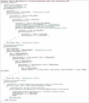 Jako ostatnią omówimy funkcję obsługi przerwania od porównania zawartości licznika Timer2 z zawartością rejestru OCR2A tegoż modułu, która to wywoływana co 10ms (czyli 100 razy na sekundę) realizuje całą, założoną funkcjonalność programowego zegara RTC. Funkcję pokazano na listingu 12. Wspomniana powyżej funkcja obsługi przerwania TIMER2_COMPA_vect korzysta ze zmiennych globalnych modułu, których definicje przedstawiają się następująco:timerType Timer; clockTypeClock; alarmType Alarm;
