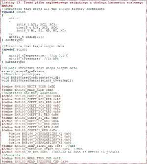Pora na szczegóły implementacyjne. Zacznę od pliku nagłówkowego związanego z obsługą barometru, którego zawartość pokazano na listingu 13. Uważny Czytelnik zapewne zwróci uwagę na dość ciekawą konstrukcję struktury danych przechowującej współczynniki korekcyjne.
