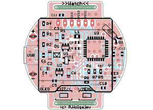 Schemat montażowy pokazano na rysunku 3. Jak widać, zaprojektowano "zgrabną", niewielką płytkę drukowaną, która kształtem przypomina zegarek naręczny umożliwiając też zamocowanie typowego paska utrzymującego ją na nadgarstku (przewidziano odpowiednie, podłużne otwory montażowe).