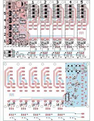 W tym celu nie zostały one pokryte soldermaską. 4-wyprowadzeniowe złącza ARK lutujemy wyjściami w prawo, aby łatwiej było wprowadzać przewody. Zwierane pary zostały oznaczone kreskami na segmencie "1". Jeśli chcemy korzystać z lampek neonowych, montujemy transoptory (najlepiej zastosować 6-pinowe podstawki) i rezystory przy neonówkach. Upewnijmy się tylko, czy te rezystory mają właściwe oporności. Jeśli będą miały zbyt małą rezystancję (wskutek błędnego sortowania) oprócz niego możemy uszkodzić transoptor, lampkę i ścieżki na płytce.