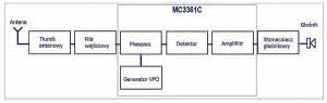Z filtru wejściowego sygnał jest podawany na wejście mieszacza-detektora odbiorczego (układ MC3361C) - w układzie o bardzo dużym wzmocnieniu. Na drugie wejście mieszacza podany jest sygnał z przestrajanego generatora VFO, zrealizowanego w układzie Colpittsa z wykorzystaniem aktywnych elementów wewnątrz struktury tego samego układu scalonego.