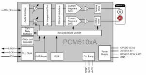 Schemat blokowy układu PCM5102A pokazano na rysunku 1. Dzięki wbudowanej pętli PLL układ może pracować także bez zewnętrznego generatora przebiegu zegarowego MCLK, odtwarzając go z sygnałów zegarowych interfejsu I2S.