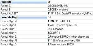 W pierwszym kroku należy ustawić bity konfiguracyjne zgodnie z rysunkiem 6 (low fusebit: 3F, high fusebit: D7), a następnie wgrać do mikrokontrolera kod z pliku HEX (dostępny w materiałach dodatkowych).