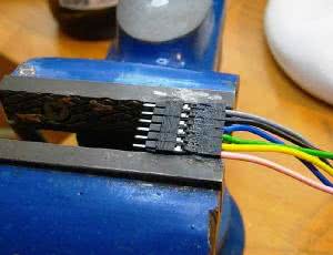 Klejenie uprzednio odtłuszczonych wsuwek "goldpin" wykonujemy tylko u nasady złączy - bardzo małą ilością kleju. Najwygodniej i najdokładniej można to zrobić po wciśnięciu grupy sześciu "goldpinów" żeńskich na niezalutowaną listewkę męskich "goldpinów" oraz częściowym zaciśnięciu takiego zestawu na czas klejenia w małym imadełku, aby każde z sześciu połączeń stykowych było jak najstaranniej wycentrowane i równoległe do pozostałych.