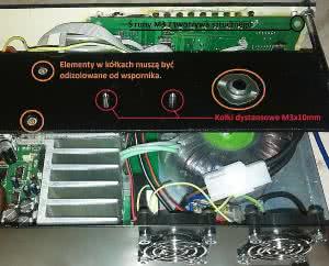 Podczas montażu płytek w obudowie należy pamiętać, że masa płytek nie może mieć połączenia elektrycznego z obudową. Do zamocowania płytek można użyć np. tulejek dystansowych z tworzywa sztucznego. Obudowa nie jest zbyt sztywna i dlatego usztywniłem ją za pomocą dodatkowego, stalowego płaskownika. Również śruba mocująca transformator sieciowy do spodu obudowy została przykręcona do płaskownika.