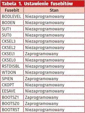 Wszystkie potrzebne sygnały do programowania mikrokontrolera zostały wyprowadzone na złączu szpilkowym Z1, dzięki czemu nie trzeba programować mikrokontroler w dedykowanej podstawce przed wlutowaniem, a można tego dokonać po zmontowaniu układu. Bity konfiguracyjne mikrokontrolera należy ustawić zgodnie z tabelą 1 (fuse high byte: 0xD9, fuse low byte: 0xFD).