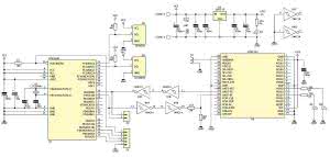 Komunikacja z modułem odbywa się za pomocą UART. Moduł jest zasilany napięciem 3,3 V, natomiast mikrokontroler 5 V, dlatego zastosowano konwerter poziomów logicznych zbudowany z użyciem bramki zawartej w układzie 74HC14 oraz dzielnika rezystancyjnego R4, R5. Wejścia niewykorzystanych bramek dołączono do masy.