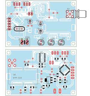 Na rysunku 5 pokazano schemat montażowy płytki termometru. Przy montażu należy zwrócić uwagę, aby nie zrobić zwarcia między wyprowadzeniami oraz nie uszkodzić termicznie układów. Po wlutowaniu mikrokontrolera, układu 74HC14 i modułu BTM222, należy wlutować pozostałe elementy SMD, aż po zworki i elementy do montażu przewlekanego, od najmniejszych po największych.