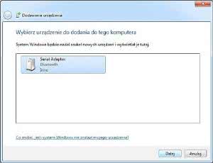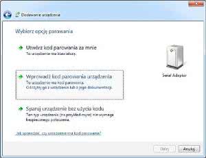 Po ukazaniu się okna, jak na rysunku 6 należy wskazać znalezione urządzenie i kliknąć Dalej. W kolejnym oknie należy wybrać opcję Wprowadź kod parowania urządzenia (rysunek 7). Następnie, należy wpisać kod "1234" i zakończyć proces parowania.
