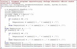 Fragment programu reprezentujący obsługę zdarzenia odbioru znaków przez port szeregowy przedstawiono na listingu 2. Okno aplikacji pokazano na rysunku 4. Po odczytaniu całej linii (do znaku przejścia do nowej linii) program rozdziela zmienne na trzy osobne łańcuchy znaków, po czym sprawdza zawartość zmiennych bitowych i na ich podstawie formatuje i wyświetla wyniki pomiarów.