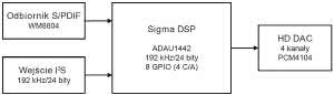 Schemat ideowy Sigma DSP_Plus podzielono na bloki funkcjonalne. Na rysunku 2 pokazano odbiornik S/PDIF. Sygnał wejściowy poprzez transformator separujący TW jest doprowadzony do odbiornika/dekodera UW1 typu WM8804.