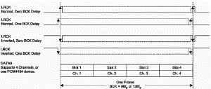 Sygnał audio nie jest przesyłany w standardzie I²S dopuszczającym transmisję tylko dwóch kanałów, ale w trybie TDM (Time Data Multiplexed), który upraszcza budowę interfejsu wielokanałowego przetwornika C/A, ponieważ sygnały wszystkich kanałów są multipleksowane czasowo i przesyłane tylko jedną linią danych. Przykładowe przebiegi pokazano na rysunku 4.