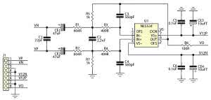 Złacze LP służy do dołaczenia diody LED sygnalizującej załączenie zasilania. Zasilacz bloków analogowych dostarcza napięć V12N/V12P do zasilania filtrów LPF oraz V5A do zasilania części analogowej PCM4104. Zasilacz jest oparty o niskoszumne stabilizatory typu ADP-7104-ADJ (dla V12N/V12P, ±12 V) w wersji o regulowanym napięciu wyjściowym, Napięcie jest ustalane za pomocą dzielników rezystorowych RD1...RD6.