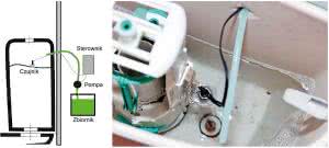 Pompa perystaltyczna ma charakter ssąco-tłoczący, co upraszcza budowę instalacji do minimum. W projekcie autora całość składa się z 2-litrowego kanisterka z detergentem, wężyka z pompką, który prowadzi od zbiornika do tylnej ścianki zbiornika na wodę, w którym - przez wywiercony otwór - wężyk wprowadzony jest do zbiornika, jak na rysunku 1.