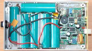 Do zasilania użyto popularnych akumulatorów litowo-jonowych 3,7 V typu 18650 (O18×65 mm). Można je kupić nowe lub lepiej pozyskać z uszkodzonych pakietów akumulatorowych z laptopów. Są one bardzo wydajne (pojemności ok. 2200 mAh) i zapewniają długi czas działania, bo w wykonanym układzie pompa załączana jest na około 3 sekundy w cyklu.