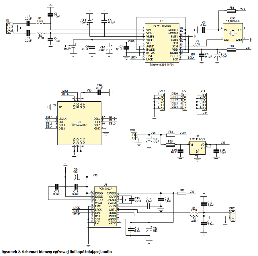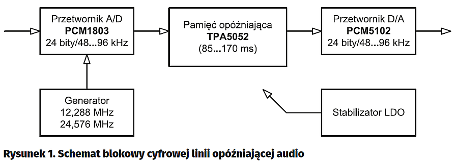 Schemat blokowy cyfrowej linii opóźniającej pokazano na rysunku1, a ideowy na rysunku2. Sygnał wejściowy z gniazda IN, po odseparowaniu składowej stałej i podstawowej filtracji dolnoprzepustowej jest podawany na wejście przetwornika A/D typu PCM1803 (U1). Pracuje on w trybie master i jest taktowany zewnętrznym, stabilnym generatorem kwarcowym OSC o częstotliwości zależnej od zastosowania: