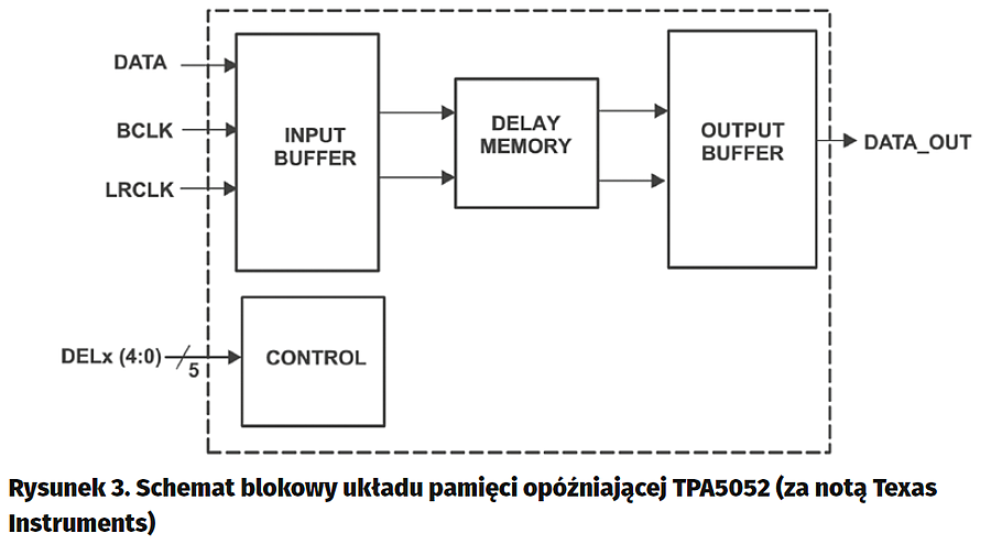 Sygnał I2S z przetwornika A/D jest doprowadzony do układu pamięci U2 typu TPA5052, której schemat blokowy przedstawiono na rysunku3. Układ pamięci ma obwody wyciszania, dzięki którym zarówno podczas włączenia, jak i zmiany opóźnienia wyjście SDO jest wyciszane, co zapobiega niepożądanym efektom dźwiękowym.
