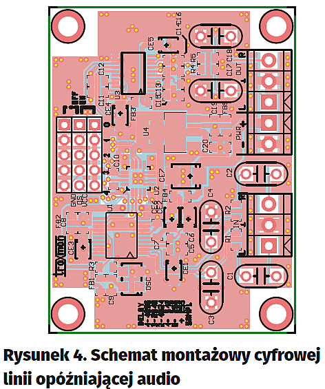 Układ zmontowano na niewielkiej, dwustronnej płytce drukowanej. Sposób montażu jest typowy i nie wymaga opisywania, rozmieszczenie elementów przedstawia rysunek4. Linia opóźniająca nie wymaga uruchomienia. Po zmontowaniu i sprawdzeniu poprawności działa od pierwszego włączenia.