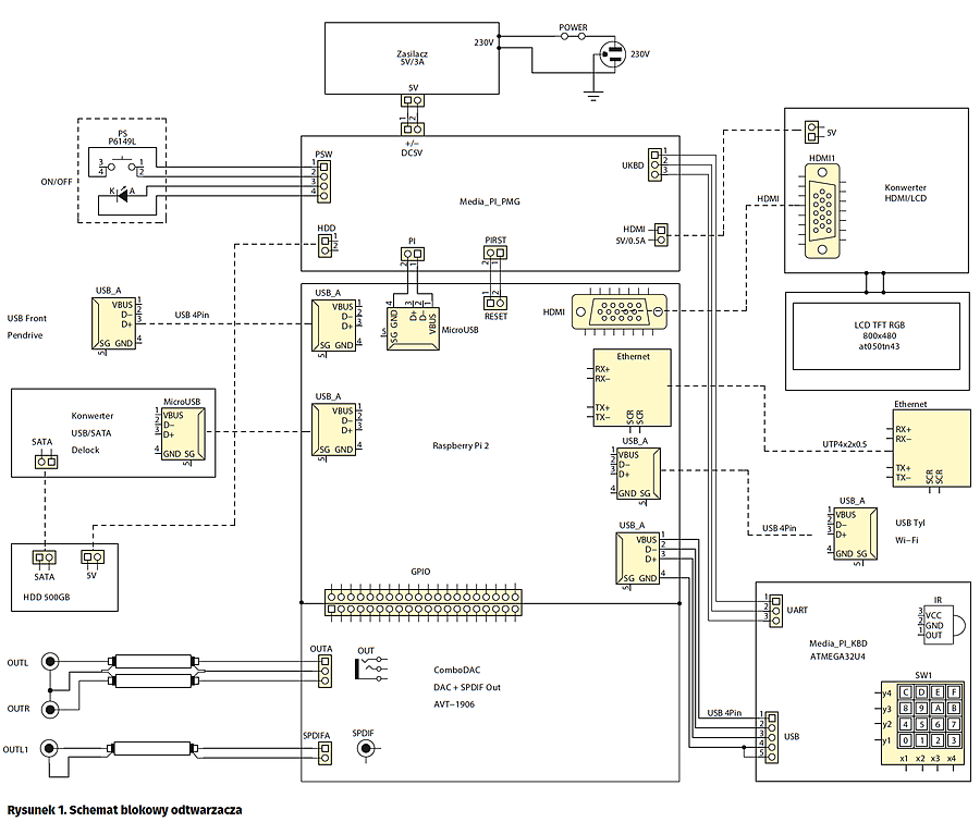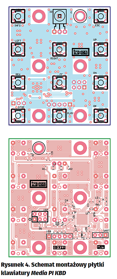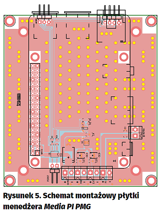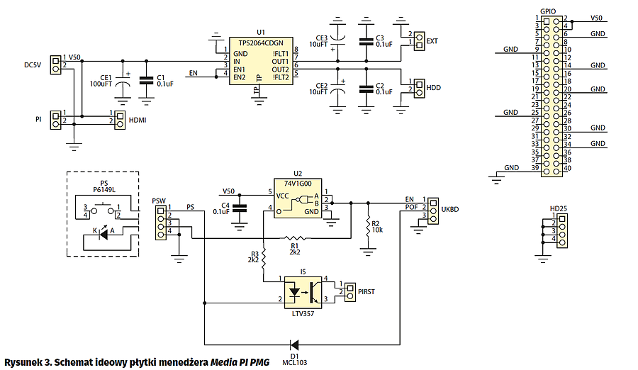 Ze względu na brak kompleksowego rozwiązania dla wyłącznika zasilania Raspberry PI, klawiatura przejmuje także funkcje związane ze sterowaniem załączaniem zasilania. Część wykonawcza układu mieści się na płytce Media PI PMG, której schemat pokazano na rysunku 3.