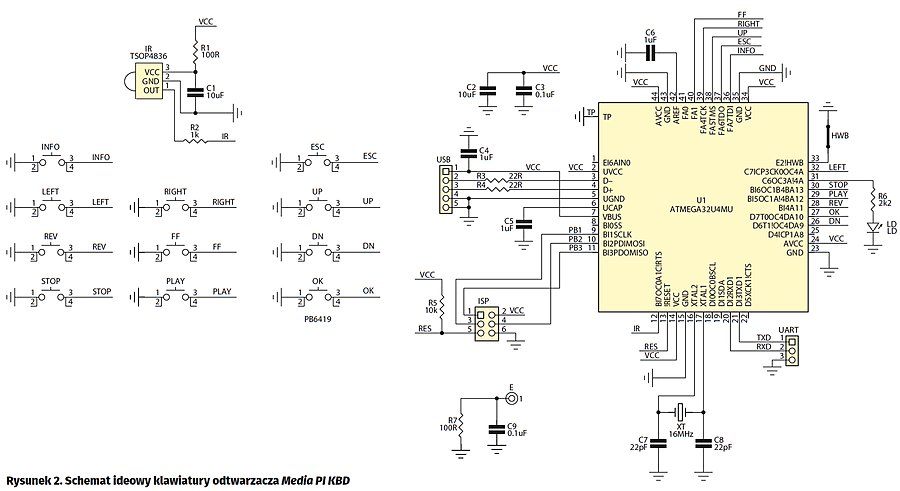 Do obsługi odtwarzacza służy 12-przyciskowa klawiatura z wszystkimi potrzebnymi przyciskami, zarówno nawigacyjnymi, jak i obsługującymi odtwarzanie. Klawiatura wykorzystuje mikrokontroler ATmega32U4 symulujący pracę płytki Arduino Leonardo. Dzięki temu można było łatwo wykonać urządzenie, które służy jako klawiatura i odbiornik podczerwieni (kod RC5). Dzięki oprogramowaniu napisanemu w środowisku Arduino jest możliwa łatwa modyfikacja na przykład w celu dostosowania do odbioru rozkazów z innego pilota. Klawiatura jest dołączona jest do Raspberry PI przez interfejs USB, a dzięki pracy w trybie klawiatury HID nie wymaga dodatkowych driverów. Schemat ideowy klawiatury przedstawia rysunek 2.