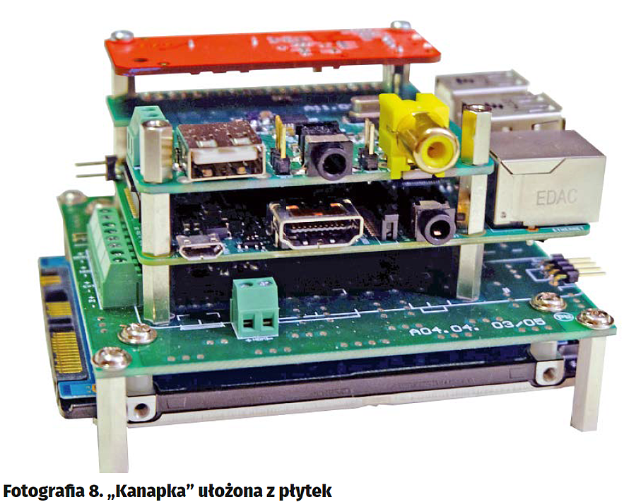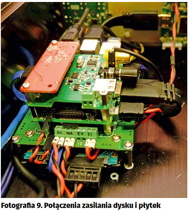 Montaż układu zależy od zastosowanej obudowy. W prototypie dysk jest zamocowany do płytki Media PI PMG od spodu za pomocą tulejek amortyzujących. Mikrokomputer Raspberry PI z płytką Combo i konwerterem SATA za pomocą tulejek do górnej strony Media PI PMG. Wyświetlacz LCD, klawiatura i przełącznik zasilania są mocowane do płyty czołowej. Sposób montażu pokazano na fotografiach 6…8. Jako kable SATA i HDMI wykorzystano dostępne na aukcjach kable płaskie o długości około 30 cm. Jest do dosyć ważne ze względu ma możliwość uszkodzenia (wyrwania) złącz, szczególnie HDMI zbyt twardymi kablami.