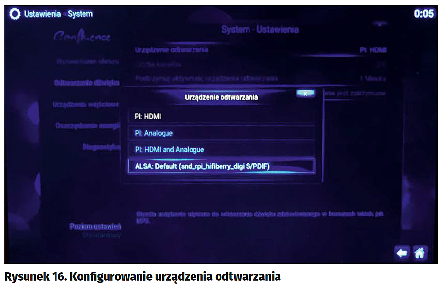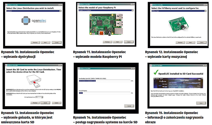 Po pobraniu ze strony https://goo.gl/KpYVfY i uruchomieniu instalatora należy postępować zgodnie ze wskazówkami, wybierając odpowiednią wersję dystrybucji i Raspberry PI (rysunki 10…15). Po zainstalowaniu i uruchomieniu należy skonfigurować urządzenie wyjściowe audio w zakładce SystemUstawieniaOdtwarzanie dźwiękuUrządzenie odtwarzania na ALSA (snd_rpi_hifiberry_digi S/PDIF), jak na rysunku 16 i spersonalizować system.