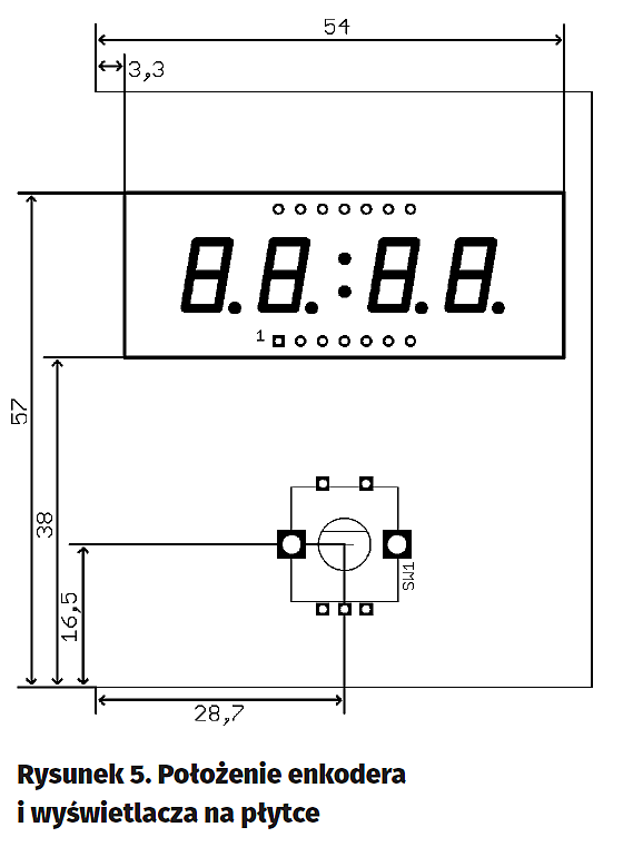 Od górnej strony płytki drukowanej znajduje się wyświetlacz LED, enkoder i kilka elementów SMD oraz mikrokontroler. Wszystkie pozostałe elementy należy wlutować od spodu płytki. Dzięki temu dokonywanie regulacji oraz włożenie płytki do obudowy nie będzie nastręczało problemów. W obudowie Z32 należy wykonać kilka otworów. W górnej pokrywie musi znaleźć się prostokątny otwór pod wyświetlacz oraz okrągły pod oś enkodera, o średnicy min. 6 mm. Położenie tych elementów na płytce ilustruje rysunek 5.