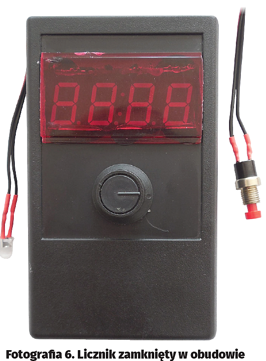 Licznik osadzony w obudowie prezentuje fotografia 6. Widać na niej również, że wyprowadzenia fototranzystora i przycisku zostały zabezpieczone rurką termokurczliwą. Kable prowadzące do tych elementów nie muszą być ekranowane, o ile długość połączenia nie przekroczy ok. 1 m. W przypadku kabla łączącego fototranzystor należy pamiętać, aby pojemność pomiędzy przewodami nie była znacząca – dlatego lepiej użyć niedługiego odcinka kabla nieekranowanego.