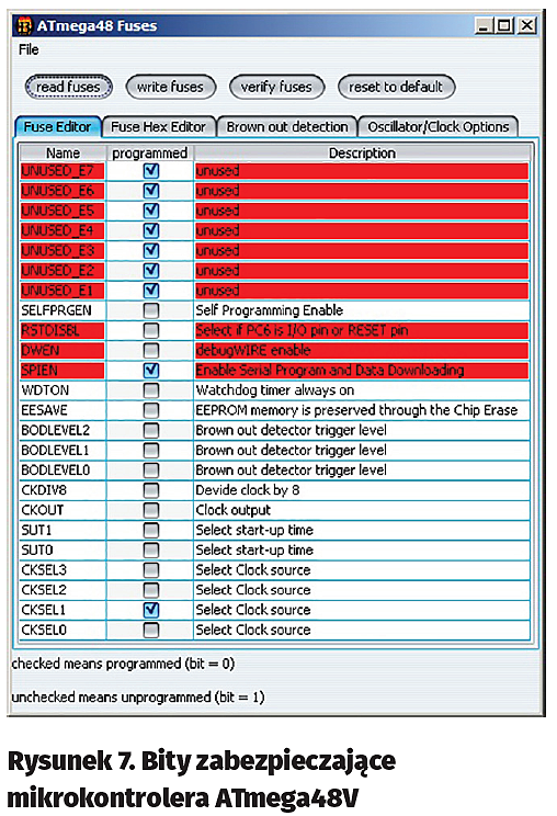 Konfigurację tych bitów w programie AVR Burn-O-Mat pokazuje rysunek 7. Po wykonaniu powyższych czynności należy przystąpić do podłączenia odpowiednich przewodów z kabla pilota sterującego aparatem.
