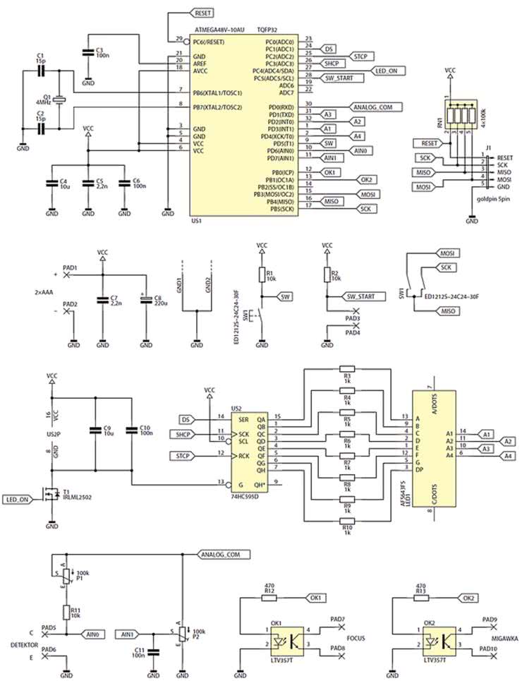 Detekcja błysków jest realizowana za pomocą fototranzystora dołączonego przewodami do pól lutowniczych PAD5 i PAD6. Pracuje on w układzie wspólnego emitera, a obciążeniem kolektora jest rezystancja składająca się z rezystora R11 i potencjometru P1. Potencjometrem można ustalać czułość układu: im wyższa jest sumaryczna rezystancja widziana przez kolektor, tym większe wzmocnienie ma układ.