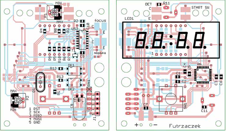 Licznik błysków zmontowano na dwustronnej płytce drukowanej o wymiarach 57,2 mm×68,8 mm. Schemat montażowy pokazano na rysunku 4.
