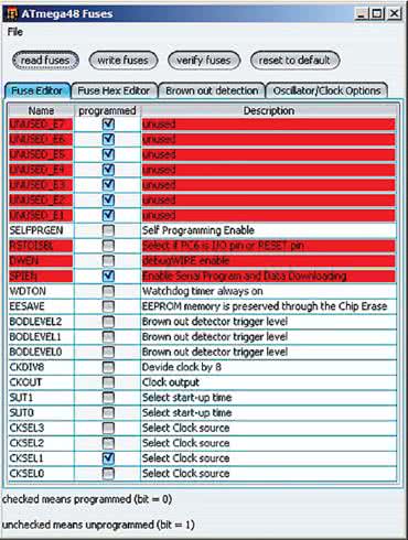 W pierwszej kolejności należy zaprogramować pamięć Flash mikrokontrolera ATmega48V odpowiednim wsadem. Trzeba również zmienić bity zabezpieczające, aby sygnał zegarowy był stabilizowany kwarcem.