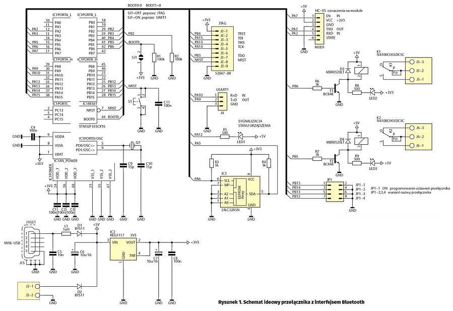 Schemat ideowy przełącznika z interfejsem Bluetooth pokazano na rysunku 1. Komendy sterujące, wysyłane np. z programu uruchomionego na smartfonie, odbierane są przez moduł Bluetooth MOD1 (HC-05). Moduł jest dołączony do linii RxD i TxD interfejsu UART2 mikrokontrolera IC1 (STM32F103C8). Poprzez port UART2 kontroler odczytuje rozkazy odebrane przez moduł MOD1 oraz wysyła potwierdzenia. W pamięci EEPROM układu IC3 pamiętane są takie nastawy, jak nazwa własna przełącznika wyświetlana na smartfonie i czasy załączenia każdego przekaźnika. Mikrokontroler steruje cewkami przekaźników podłączonymi do kolektorów tranzystorów T1, T2 zabezpieczonych przed przepięciami diodami D3, D4. Dioda LED1 służy do sygnalizacji stanu sterownika.