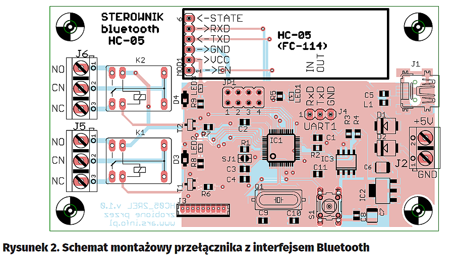 Schemat montażowy przełącznika pokazano na rysunku 2. Ponieważ najmniejsze obudowy elementów na płytce są typu 0805, montaż nie powinien przysporzyć problemów nawet średnio zaawansowanemu elektronikowi. Jedyną decyzją, którą należy podjąć w czasie montażu, jest sposób dołączenia modułu MOD1. Jeżeli do zamocowania modułu użyjemy gniazda tzw. goldpinów, moduł w stosunku do płytki drukowanej będzie mocowany prostopadle i zajmie sporo miejsca. Alternatywnie można moduł położyć na płytce i przyłączyć za pomocą dodatkowo wykonanego mostka. W tym celu najpierw należy do płytki wlutować grzebień 6 prostych goldpinów. Następnie do goldpinów trzeba przylutować pod kątem prostym gniazdo dla modułu. Lutowanie gniazda najwygodniej przeprowadzić, gdy jest ono nałożone na wyprowadzenia modułu HC-05.
