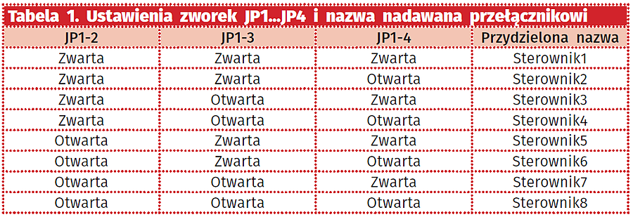 • Nazwa: nadawana jest nazwa „Sterownik x”, gdzie x jest numerem z przedziału 1…8. O wyborze numeru decyduje ustawienie zworek JP1…JP4 w momencie przywracania ustawień początkowych. W tabeli 1 podano kombinacje ustawień zworek.
