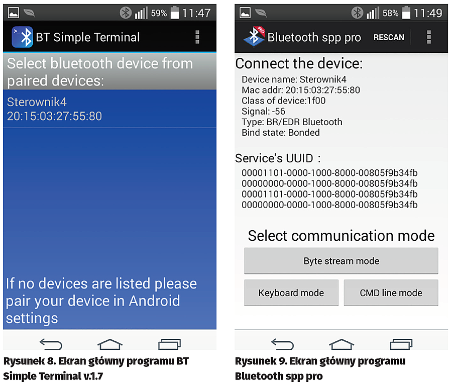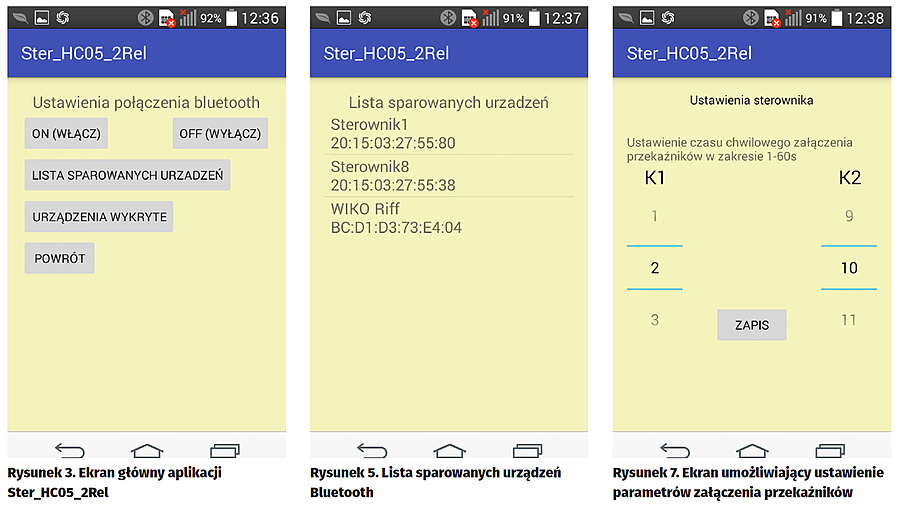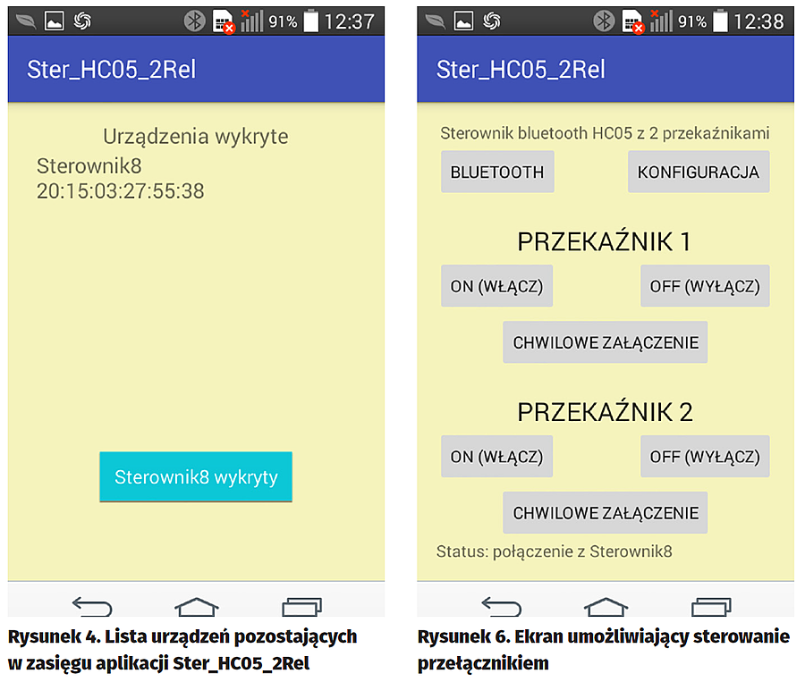 Po uruchomieniu aplikacji pojawi się ekran podobny do tego pokazanego na rysunku 3. Zależnie od stanu urządzenia może wyświetlić się także prośba o pozwolenie włączenia modułu Bluetooth. Na początku aktywny jest tylko przycisk BLUETOOTH, po którego naciśnięciu przechodzi się do opcji związanych z interfejsem radiowym. Ekran wyboru opcji pokazano na rysunku 3. Korzystając z przycisków, można włączyć lub wyłączyć interfejs Bluetooth w smartfonie, wyświetlić listę urządzeń pozostających w zasięgu (rysunek 4) oraz listę urządzeń sparowanych (rysunek 5). Klikając na pozycję z listy sparowanych urządzeń, inicjujemy połączenie pomiędzy smartfonem a urządzeniem, np. Sterownik8. Po nawiązaniu połączenia następuje automatyczny powrót do ekranu pierwszego, którego wygląd się zmienił (rysunek 6). Stają się dostępne pozostałe przyciski, po których naciśnięciu można sterować włączaniem i wyłączaniem przekaźników K1 i K2. Na dole ekranu jest wyświetlana nazwa przełącznika, z którym nawiązano połączenie i który jest kontrolowany.
