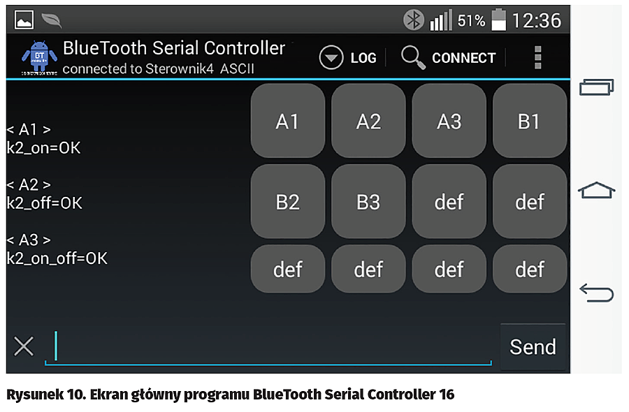 Na rysunku 8 pokazano widok ekranu startowego programu. Pracuje on z wcześniej sparowanymi urządzeniami Bluetooth. Z wyświetlanej listy należy wybrać urządzenie, z którym program ma się połączyć – w tym wypadku będzie to Sterownik4. Z interesujących nas właściwości program ma pole do ręcznego wpisywania tekstów do wysłania (ASCII data). Dodatkowo jest dostępnych 6 przycisków i pole wyświetlające komunikaty potwierdzeń odbierane ze sterownika. Każdy z 6 przycisków może być indywidualnie oprogramowany przez użytkownika. Dzięki temu każdemu z nich można przypisać rozkaz sterujący, który będzie wysyłany po naciśnięciu.