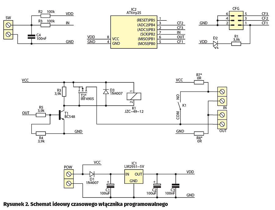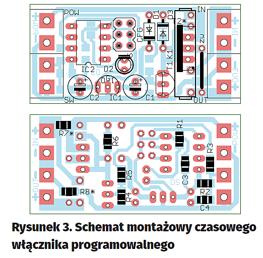 Na płytce przewidziano miejsca dla 4 opcjonalnych komponentów stosowanych tylko w określonych konfiguracjach. Rezystory R7* i R8* można zamontować tylko wtedy, gdy urządzenie steruje obwodem napięcia stałego 12 V i chcemy, by było zasilane z tego obwodu. Wtedy do złącza IN należy doprowadzić napięcie 12 V z zachowaniem polaryzacji oznaczonej na płytce – „minus” na zacisku wewnętrznym, „plus” na zewnętrznym. W miejsce wspomnianych rezystorów należy zamontować rezystory 0 V lub po prostu zewrzeć punkty kroplami cyny. W takiej konfiguracji nie trzeba dołączać zasilania do złącza POW. Jeśli będą zamontowane rezystory R7* i R8*, to można dodatkowo zamontować tranzystor T2* i zworkę ZW. Wtedy elementem wykonawczym będzie tranzystor MOSFET (nie należy montować przekaźnika), który będzie załączał „plus” obwodu wyjściowego. Napięcie zasilające może wynosić 6…20 V. Taką konfigurację można zastosować, montując urządzenie np. w instalacji auta.
