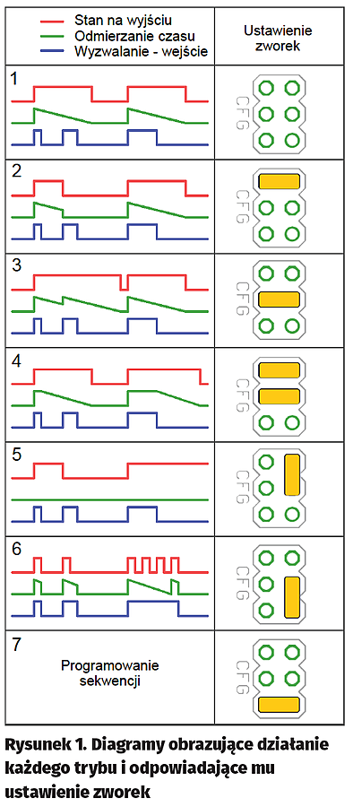Urządzenie może działać w jednym z 7 trybów pracy wybieranych ustawieniem zworek na złączu szpilkowym CFG. Na rysunku 1 zamieszczono diagramy obrazujące działanie każdego trybu i odpowiadające mu ustawienie zworek, a poniżej znajduje się krótki opis każdego z nich. Urządzenie wybiera tryb pracy tylko w momencie włączenia zasilania, później stan zworek nie jest sprawdzany.