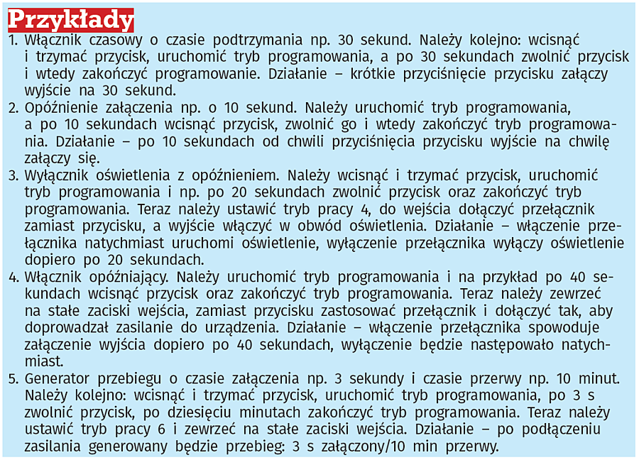 Przykłady programowania wyłącznika wraz z przykładami zastosowań podano w ramce.