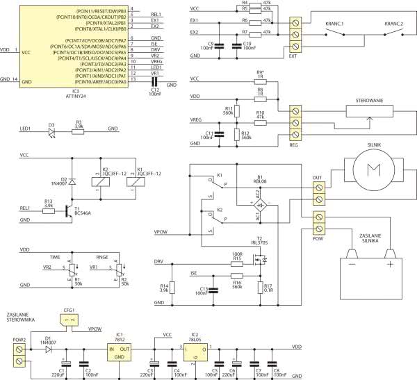 Schemat ideowy sterownika silnika pokazano na rysunku 1. Stopień wykonawczy zrealizowano za pomocą dwóch przekaźników, które odpowiadają za zamianę polaryzacji napięcia na wyjściu i tranzystora mocy, który załącza to napięcie. Tranzystor sterowany jest przebiegiem PWM. W ten sposób, poprzez regulację prądu średniego płynącego przez uzwojenie silnika, jest regulowana prędkość obrotowa zasilanego silnika oraz realizowana funkcja łagodnego startu. Ważne jest, aby tranzystor wykonawczy był typu „Logic Level Compatible”, ponieważ jest sterowany bezpośrednio z wyprowadzenia mikrokontrolera.