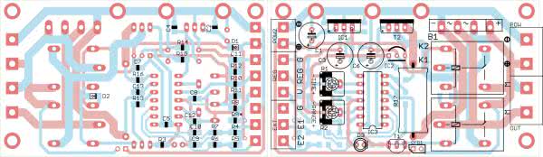 Schemat montażowy sterownika pokazano na rysunku 2. Urządzenie jest zbudowane z komponentów do montażu mieszanego (SMD i THT), jednak pomiędzy nimi są duże odstępy i dlatego montaż nie powinien sprawić większych problemów. Elementy IC1 i IC2 należy przykręcić do radiatora poprzez podkładki izolujące, mostek B1 nie wymaga radiatora i nie musi być przykręcony. Ścieżki, które będą przewodziły znaczne prądy, warto pocynować.