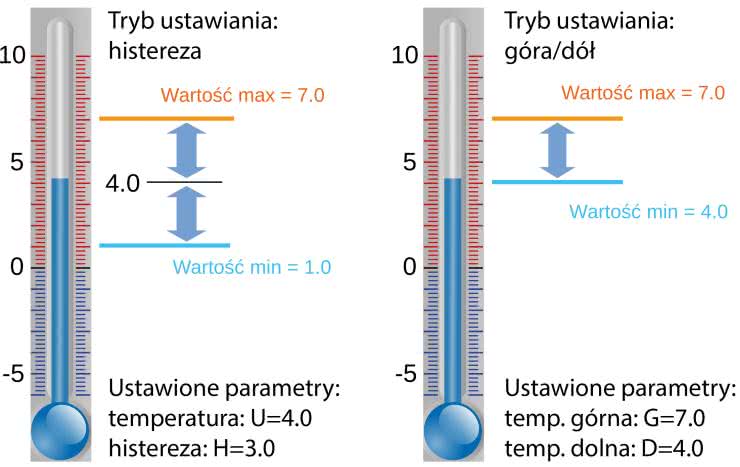 - Dwa tryby ustawiania parametrów: „histereza” lub „góra/dół”.